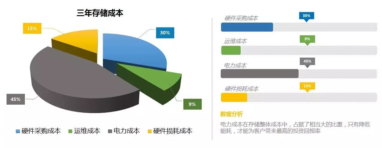 數(shù)據(jù)顯示,存儲(chǔ)的成本主要由硬件采購(gòu)成本、運(yùn)維成本、電力成本和硬件損耗成本所組成,其中唯有電力成本是可以通過(guò)數(shù)據(jù)管理加以控制和改善的因素。